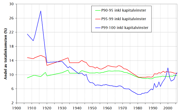 1. Hur ska detta tolkas? Att 1 % av befolkningen har 10% av de totala inkomsterna, och 10 % av befolkningen 30 % av inkomsterna. Och att inkomstspridningen ökat sedan 80-talet då … Intressant att se nedgångarna i toppinkomster vid världskrigen och börskraschen 1929. Det säger något om inkomstklyftor? Ser fördelningen för förmögenhet ut på liknande sätt? (Man blir nyfiken).