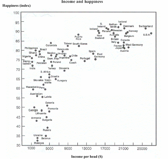 Som Daniel konstaterat i ett av gårdagens inlägg verkar den avtagande lyckoeffekten av högre BNP nivåer kunna ifrågasättas. Det finns dock andra paradoxer kvar att förklara. För nog är det något konstigt med att östeuropéer är så mycket mer missnöjda med livet än vad man skulle vänta sig givet deras BNP per capita nivå. Se bara på bilden till höger som visar relationen mellan självrapporterad lycka och BNP per capita. Punkterna nerifrån räknat är Moldavien, Ukraina, Vitryssland, Ryssland, Armenien, Bulgarien, Rumänien, Litauen, Estland, Lettland, Azerbadjan, och först därefter kommer det första land som inte tillhört det forna östblocket, Peru. Alla dessa rapporterar alltså att de i genomsnitt är betydligt olyckligare än andra länder med liknande (eller lägre) per capita inkomst. Hur kan detta komma sig?