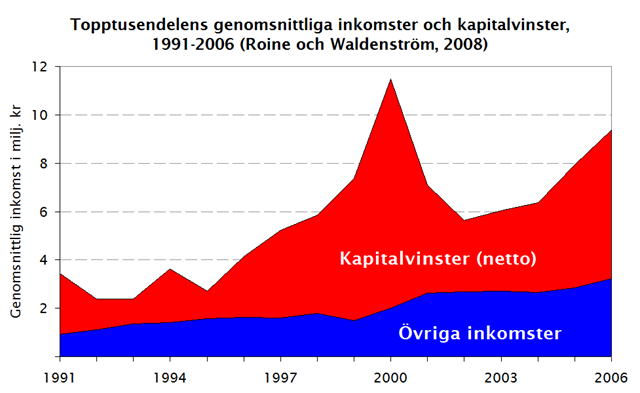 I det svenska fallet har lönespridningen som sagt ökat något men den stora ökningen av toppinkomstandelarna framträder när vi inkluderar kapitalvinster. Om dessa kapitalvinster är kopplade till toppinkomsttagarnas yrkesutövning så skulle det tyda på att liknande mekanismer som verkar i USA och England även ligger bakom den ökade inkomstkoncentrationen i Sverige. Men om dessa kapitalvinster inte har någon koppling till toppinkomsttagarnas arbete antyder detta i stället att, precis som i början av seklet, den som blir rik i Sverige blir det genom att göra goda investeringar, inte genom arbete.