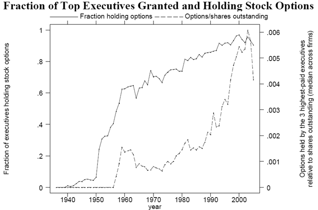 • Tvärt emot tidigare trosuppfattningar var aktieoptioner vanliga även före 1970. Bilden nedan visar att en majoritet av direktörerna hade aktieoptioner redan på 1950-talet (heldragen linje och vänster y-axel). Lönernas känslighet för företagets utveckling var rentav något större på 60-talet än på 80-talet.