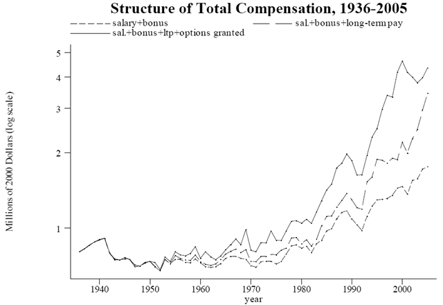 De två amerikanska ekonomhistorikerna Carola Frydman och Raven Saks har till en ny uppsats samlat in uppgifter om direktörslöner i börsbolag i USA från årsrapporter mellan 1937 och 2005. Kartläggningen är unik och tyvärr finns inga liknande data för Sverige. Forskarna finner två huvudresultat: