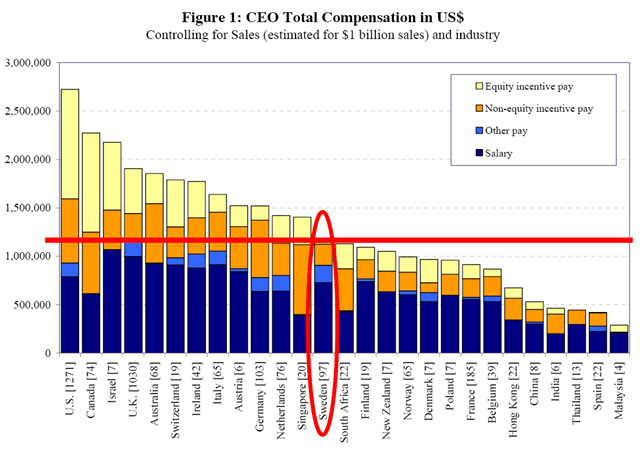 Resultatet kan visas i tre bilder. Den första bilden (Figure 1) nivån på genomsnittliga VD-löner i USD och med hänsyn tagen till respektive företags omsättningsstorlek. Klart högst betalda är VD:ar i USA, med en snittslön på ca 19 mkr (SEK/USD=7). Sverige, inringat i rött och med nivån markerad med röd linje, ligger på 13:e plats med en snittlön på ca 8 mkr, dvs mindre än hälften än deras amerikanska motsvarigheter.