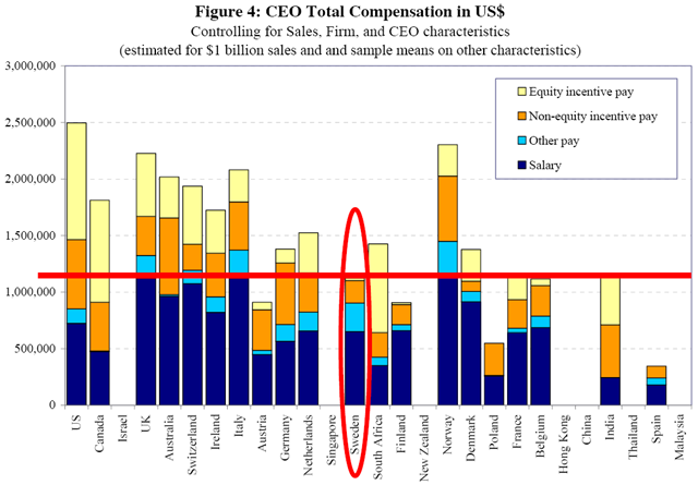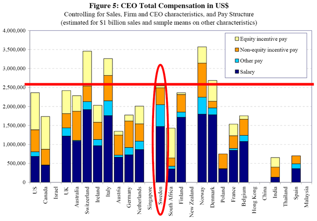 Men när forskarna i Figure 5 slutligen tar hänsyn till hur mycket incitamentslöner VD får (aktiers andel, optionernas värde mm) blir bilden annorlunda. Rörlig lön är typiskt sett högre än fast lön eftersom den utsätter VD för inkomstosäkerhet. Bilden visar också att amerikanska VD:ar, som har hög andel rörlig lön, inte längre är högst betalda. Istället är det Norge som förefaller ha världens högst betalda (mest överbetalda?) VD:ar! För Sverige förändras bilden radikalt. Vi seglar upp till en 5:e plats i landjämförelsen, vilket förklaras av att svenska VD:ar har relativt låg andel rörlig lön.