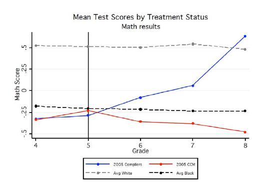 Resultatet kommer från en utvärdering av ett ambitiöst projekt att utveckla utsatta områden i Harlem. En central del av Harlem Children’s Zone (HCZ) är att erbjuda bra utbildning vid Promise Academy. Eftersom dessa skolor är mycket populära fördelas platserna med lottning och Fryer har följt och jämfört vinnarna och förlorarna i lottdragningen. Resultatet visas bäst i en figur.