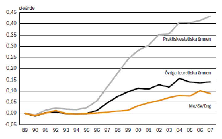 En figur från Skolverket (fig 3.2, sid 48) pekar med all önskvärd tydlighet på behovet av återhållande krafter i betygssystemet. Det har skett en dramatisk ökning av betygen i praktiskt-estetiska ämnen, en mindre ökning i teoretiska ämnen utan nationella prov och en förhållandevis liten ökning i ämnen med nationella prov.