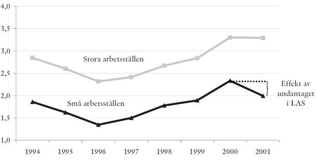 Doktoranden Martin Olsson har (i en Ekonomisk Debatt-artikel från 2007) undersökt hur ett undantag från 2001 i turodningsreglerna (”sist in, först ut”) för företag med färre än tio anställda påverkade de anställdas korttidssjukskrivningar. Genom att jämföra sjukskrivningstal i de företag som påverkades av reformen med något större företag (med 12-50 anställda) som inte gjorde, finner Olsson att sjukskrivningarna minskade med 15 procent. Effekten visas i Bild 1 nedan. (Snarlika resultat på längre sjukskrivningsperioder av reformen har även Assar Lindbeck, Mårten Palme och Mats Persson funnit).