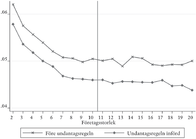 En annan studie av samma undantag i turordningsreglerna presenterades i senaste numret av IFAU-forskaren Peter Skogman Thoursie. Fokus ligger dock på vilken effekt reformen haft på småföretagens vilja att nyanställa (och avskeda). Bild 2 nedan visar nyanställningsgraden för olika företagsstorlekar (mätta längsmed x-axeln utifrån antalet anställda). Linjerna före och efter reformen är i stort sett parallella, vilket antyder att reformen inte hade någon effekt. Särskilt kan detta avläsas i (den undre) post-reformlinjen där det inte finns något brott i serien mellan företag med 10 och 11 anställda, dvs just den brytpunkt där undantaget upphörde att gälla.