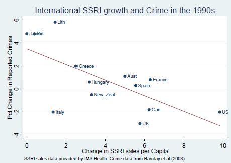Förklaringarna till varför brottsligheten i USA minskat dratiskt sedan början av 1990-talet sträcker sig från den fria aborträtten till minskade blyutsläpp. I en ny studie visar Dave Marcotte och Sara Markowitz att den ökade användningen av psykofarmaka mot beteendestörningar som ADHD verkar vara ytterligare en viktig förklaringsfaktor. Genom att relatera förändringar i brottslighet till förändringar i användningen av psykofarmaka både internationellt och på amerikansk delstatsnivå, landar Marcotte och Markowitz i att ca 12 procent av den minskade brottsligheten kan förklaras nedgången. Eftersom det framförallt är våldsbrott med stora sociala kostnader som minskar drar författarna slutsatsen att minskad brottslighet i sig gör ökad medicinering samhällsekonomiskt lönsam.