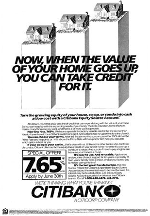 image Många menar att aggressiv marknadsföring från bolåneinstitut och liknande företag bidrog till den amerikanska bobubblan och den efterföljande krisen. Marknadsföringen försökte ofta förmedla bostaden som en säker investering vars värde endast kunde öka — se intressant artikel med många exempel i New York Times för ett drygt år sedan.
