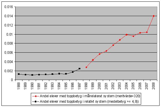 • Mellan 2005 och 2006 ökade andelen elever med 0.09 procentenheter vilket är mycket i förhållande till de flesta tidigare år. Ökningen under de två följande åren var långsammare så baserat på dessa två år kanske man kan säga att det ”planat ut”. Än mer så om andelen tom sjunkit mellan 2008 och 2009 men jag tror det är en bit kvar tills dess att betygssystemet är likvärdigt…