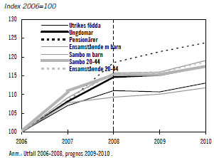 Utvecklingen av genomsnittlig disponibel inkomst för olika grupper. Inkomst exklusive kapitalvinster. Diagram 1.8 i Bilaga 4 till Vårpropositionen 2010.