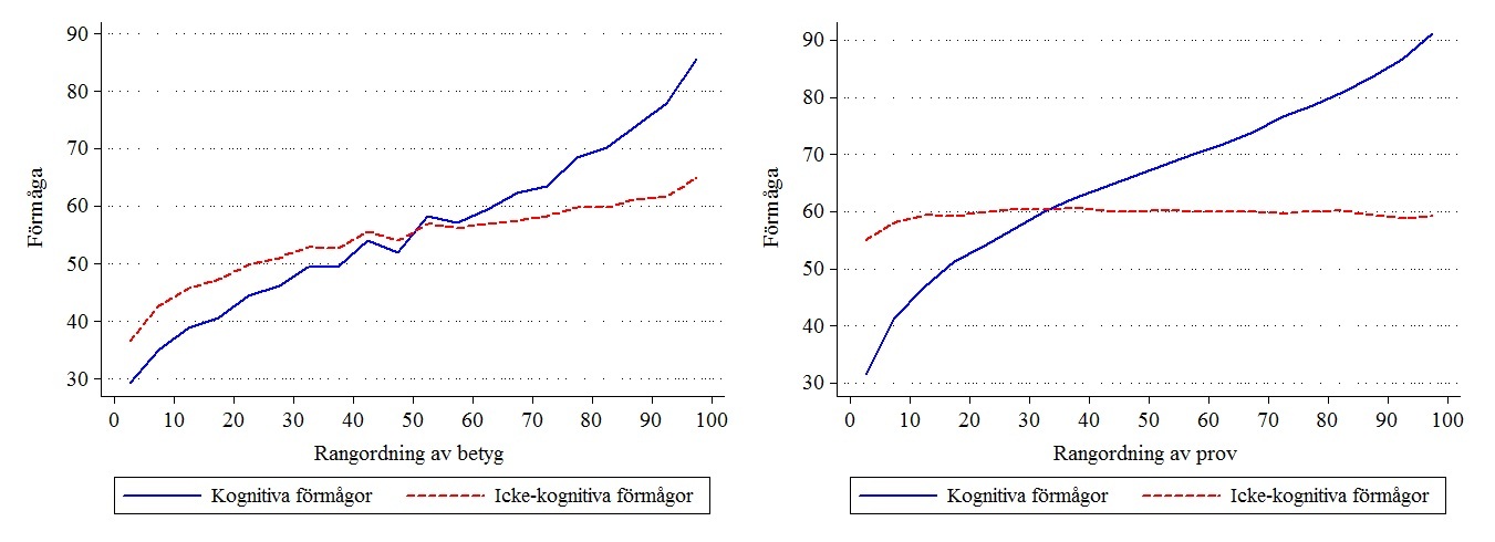 En spekulation som verkar stämma är att betygen fångar en betydligt bredare uppsättning förmågor än högskoleprovet. I figurerna nedan plottas betygen och resultaten på högskoleprovet mot de kognitiva och icke-kognitiva utvärderingarna från den militära mönstringen (alla mått är på skalan 1-100). Den icke-kognitiva utvärderingen fångar faktorer som ansvarstagande, stresstålighet och uthållighet; faktorer som är betydelsefulla för framtida framgång på arbetsmarknaden. Medan högskoleprovet förfaller vara ett renodlat intelligenstest så fångar betygen även andra viktiga egenskaper.