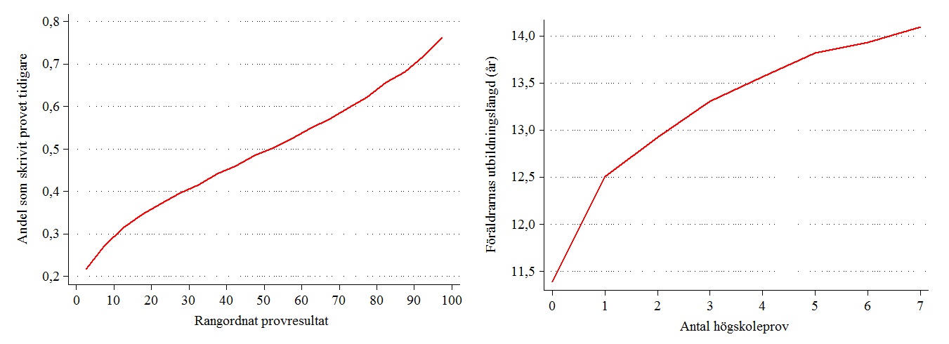 Det är alltså knappast förvånande att de flesta som uppnår höga resultat på högskoleprovet har skrivit provet flera gånger, vilket visas i den vänstra figuren nedan. Samtidigt är det betydligt vanligare att barn till högutbildade föräldrar skriver provet flera gånger, vilket syns till höger. Antagning baserad på högskoleprovet leder alltså till att studenterna blir äldre och att den sociala snedrekryteringen ökar. Samma mönster finner man för övrigt bland dem som läser upp sina betyg på komvux: en studie visar att konkurrenskompletteringarna är ren luft; det höjda meritvärdet är överhuvudtaget inte relaterat till förbättrade akademiska prestationer. En annan studie visar att betygskomplettering är betydligt vanligare bland barn till högutbildade.