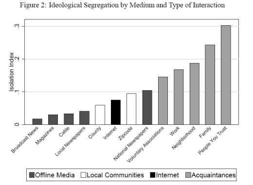 Detta tyder alltså på att vi på nätet tenderar att utsätta oss för åsikter som skiljer sig från våra egna i större utsträckning än när vi läser till exempel dagstidningar eller umgås med vänner och familj. För demokratins skull är det säkerligen nyttigt (även om det i så fall är ännu nyttigare att se på TV enligt ovanstående sätt att mäta).