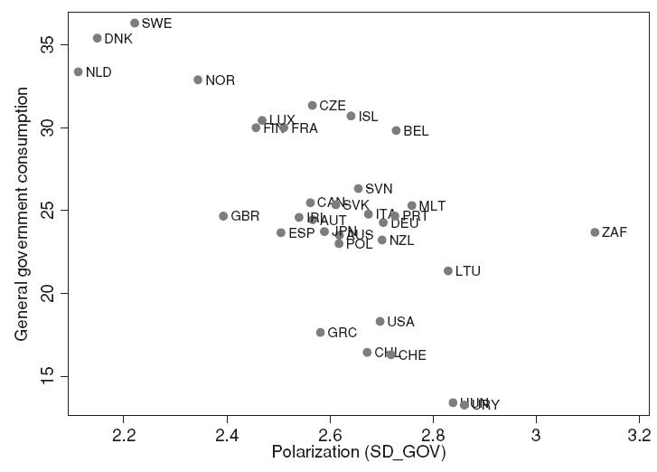 I det senaste numret av American Political Science Review dyker nedanstående figur upp. Figuren visar att det finns en stark korrelation mellan den offentliga sektorns storlek och i vilken utsträckning människor tenderar att hålla med varandra i ekonomisk-politiska frågor. De nordiska länderna och Nederländerna (längst upp till vänster i figuren) är exempel på länder med stor offentlig sektor och liten spridning i ekonomisk-politiska åsikter, medan Uruguay (längst ned till höger) är ett exempel på motsatsen.