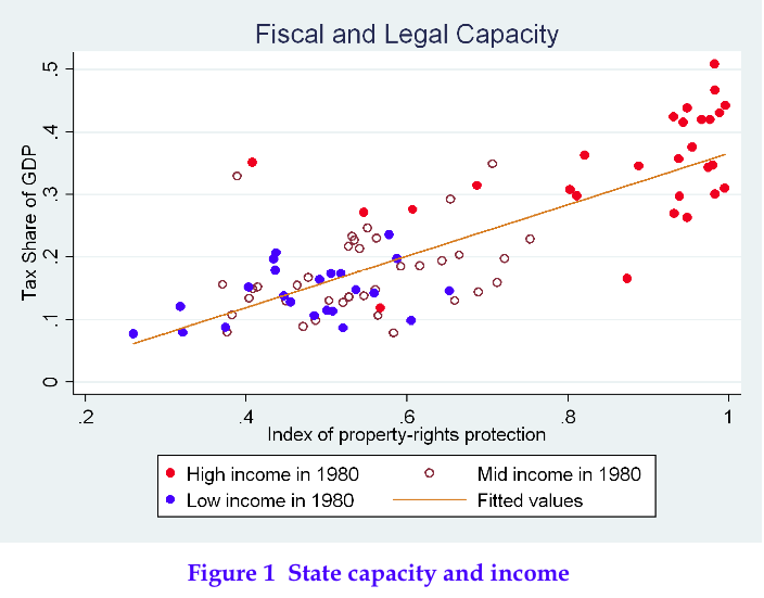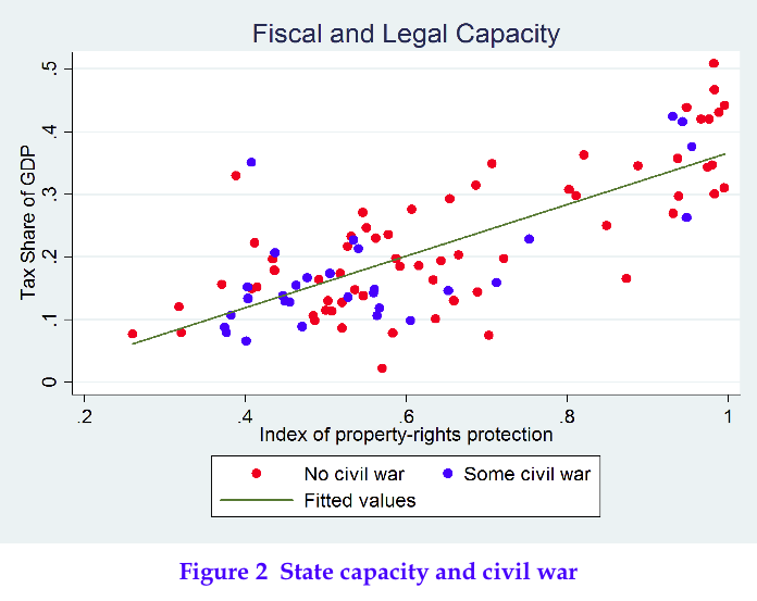 Sammantaget illustrerar figurerna ett starkt samband mellan staters skattekapacitet, deras förmåga att skydda privata äganderätter och upprätthålla kontrakt, deras ekonomiska utvecklingsnivå, och avsaknaden av inre konflikter. Figurerna är hämtade från en presentation av Torsten Persson (IIES), och presentationen är i sin tur en översikt av ett pågående forskningsprojekt tillsammans med Tim Besley (LSE). Projektet spänner över fälten ekonomi, statsvetenskap och historia och dess omfång är svindlande. Ambitionen är att förklara vad som driver uppbyggnaden av staters fiskala och legala kapacitet, hur detta hänger ihop med den ekonomiska utvecklingen och hur dessa förstärker varandra i positiv riktning, för att sedan koppla dessa samband till benägenheten att lösa konflikter genom politiska processer snarare än krig. Inte ens ett mycket långt inlägg skulle kunna göra insikterna från projektet rättvisa men som tur är finns ett antal publicerade artiklar (t.ex. här, här, här, och här) som den intresserade kan läsa.