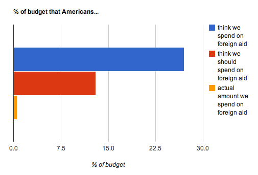 I genomsnitt vill den amerikanska allmänheten lägga 10 procent av den federala budgeten på bistånd. Detta är betydligt mindre än de 25 procent samma amerikaner tror att staten lägger på denna budgetpost. Samtidigt är det en 10 gånger större andel av budgeten än vad som faktiskt tillfaller biståndet.