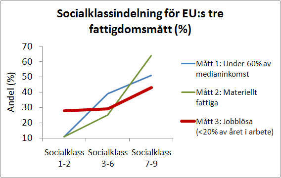 Bilden nedan illustrerar problemet. Den visar vilken social klass (baserat på EU-harmoniserade socioekonomiska klasser) som hushållen i respektive fattigdomskriterier tillhör (källa). Som synes finns en tydlig social gradient, dvs koppling mellan fattigdom och social klass, för såväl inkomstfattiga som materiellt fattiga hushåll. De jobblösa däremot tillhör i betydligt högre utsträckning (tre gånger så stor andel) de två översta socialklasserna och klart mindre de lägsta socialklasserna.