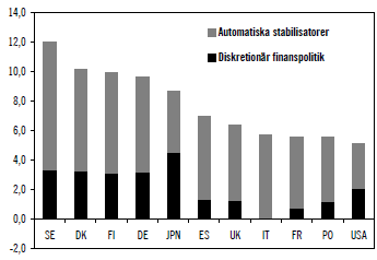 Vi har upprepade gånger fått höra av regeringen att den har fört en mycket expansiv finanspolitik under krisen. Som ett bevis på de omfattande stimulanserna visar regeringen gärna den figur som återges här till höger (klicka på den för att förstora). Enligt figuren var de finanspolitiska stimulanserna under 2009 och 2010 mer omfattande i Sverige än i andra länder, vilket till stor del förklaras av finanspolitikens automatiska stabilisatorer.
