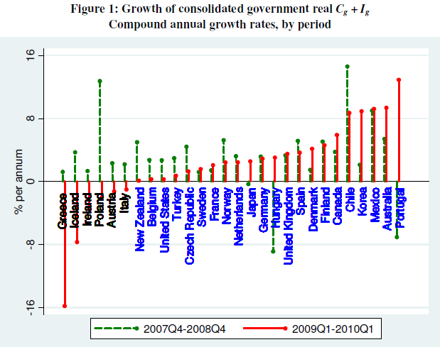 Påståendena om stora stimulanser i kombination med bibehållet starka offentliga finanser behöver inte med nödvändighet vara motstridiga. Omfattande stimulanser kan t ex vara förenliga med en oförändrad offentlig skuld om den offentliga sektorn har stora överskott i utgångsläget, så som har varit fallet i Sverige. Men jag har i ett tidigare inlägg antytt att summeringen av stimulanserna i figuren ovan är missvisande, eftersom statsbidragen till kommunerna förmodligen dubbelräknas. Därför är det inte helt överraskande att verklighetsbeskrivningen inte är entydig. Joshua Aizenman och Gurnain Pasricha har undersökt hur offentlig konsumtion och investeringar utvecklades under krisen i olika länder. Enligt Aizenman och Pasricha, som alltså bortser från stimulanser via skatter och transfereringar, var de svenska stimulanserna inte särskilt omfattande i en internationell jämförelse (se figuren till höger).