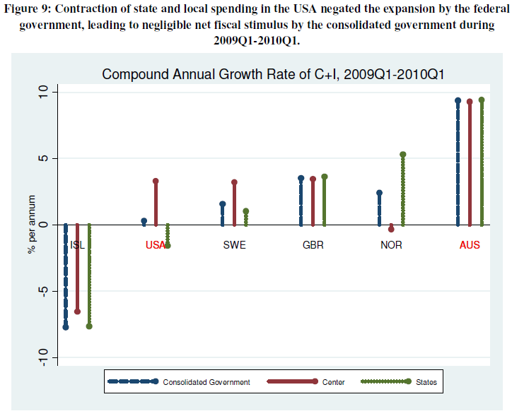 Här har den svenska krispolitiken, där höjda statsbidrag till kommunerna var ett centralt inslag, lyckats bättre än den amerikanska. I USA var omfattande skatteåterbäringar och skattesänkningar centrala inslag i både George Bushs Economic Stimulus Act och Barack Obamas American Recovery and Reinvestment Act, medan ökade anslag till delstaterna endast ingick i begränsad omfattning. Många delstater har därför akuta budgetproblem och har tvingats skära ner löner, personal och offentlig verksamhet under krisen. Figuren till höger, också från studien av Aizenman och Pasricha, visar följaktligen att de federala stimulanserna i USA har motverkats av åtstramningar på delstatsnivå. Förmodligen skulle större transfereringar till delstaterna, snarare än traditionell stimulanspolitik, ha medfört en bättre stabilisering av konjunkturutvecklingen i USA.