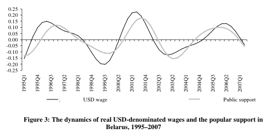 Motsvarande situation finns dock på närmare håll. Bilden nedan visar relationen mellan det politiska stödet för Vitrysslands auktoritäre president Lukasjenka och förändringar i lönenivåer (trendjusterat och i reala termer).