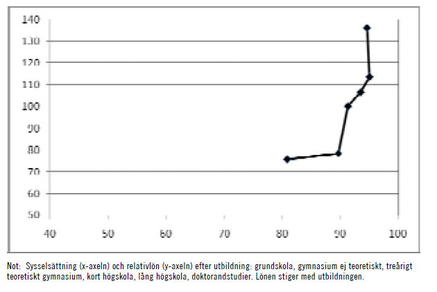 I figuren nedan (som är tagen ur Nils bilaga) visar sambandet mellan sysselsättningsgraden och relativlönerna för personer med olika utbildning för män i åldern 30-54 födda i Sverige.  På x-axeln redovisas sysselsättningsgraden och på y-axeln relativlönen jämfört med gruppen med tre-årigt gymnasium. De olika punkterna i grafen representerar olika utbildningsgrupper (grundskola, icke-teoretiskt gymnasium, 3-årigt teoretiskt gymnasium, kort högskola, lång högskola, doktorandstudier).