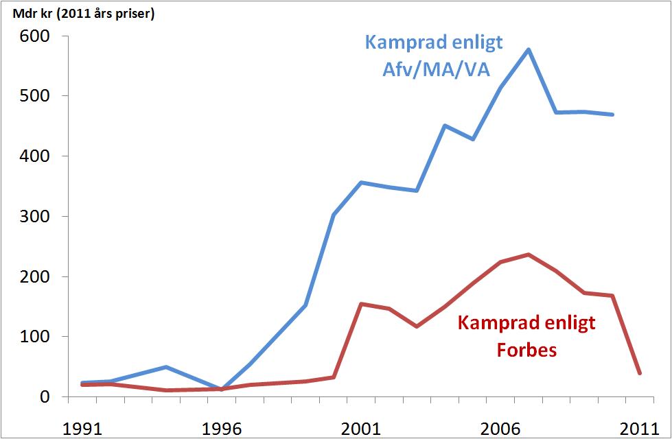 Men har Forbes – och Kamprad – rätt? Inte enligt Veckans Affärer. I VA:s lista från november 2010 angavs Kamprads förmögenhet till 470 miljarder, dvs nästan tre gånger mer än Forbes bedömning! Skillnaden är inte ny, som figuren nedan visar, utan har funnits i flera år. Huvudförklaringen är att VA (liksom föregångarna Affärsvärlden och Månadens Affärer) tillskriver Kamprad hela IKEA-imperiet, dvs inklusive de holländska stiftelserna.