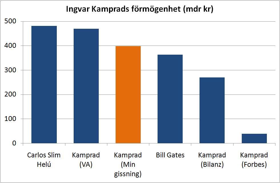 Naturligtvis är min gissning enbart ytterligare en i raden, byggd på knapphändig information och grova antaganden. Men om Ericsons uppgifter är riktiga är den så god som någon annan. Figur 2 ovan samlar alla skattningar av Kamprads förmögenhet och jämför dem med Carlos Slim Helú och Bill Gates, världens enligt Forbes två rikaste. Som framgår förändras bilden radikalt beroende på vilken gissning man väljer. Om jag eller VA har rätt är Ingvar Kamprad inte 162:a i världen, som Forbes hävdar, utan kanske rentav den rikaste människan på jorden.