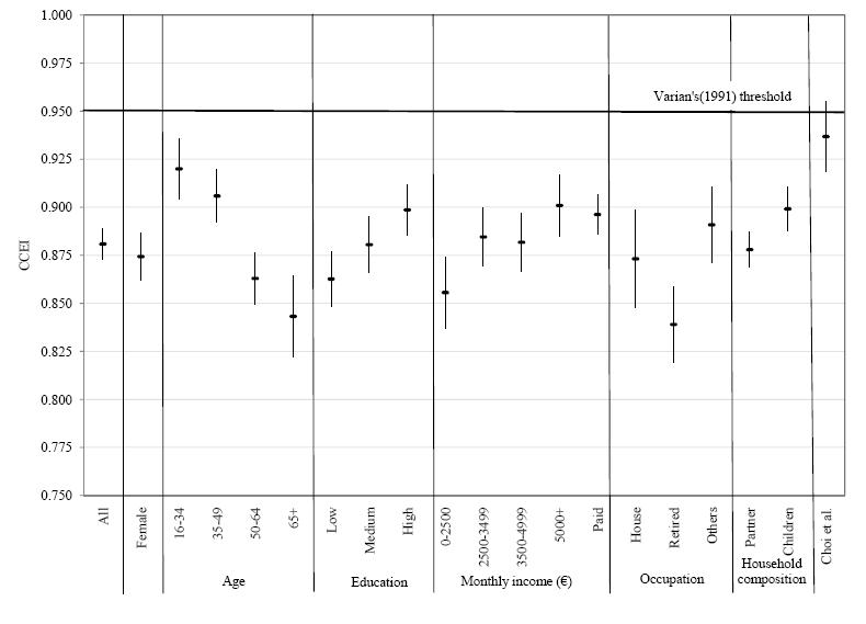 I figuren nedan visas ett mått på hur konsistenta deltagarnas val var i olika grupper (värdet 1 innebär att valen var helt konsistenta). De med högre inkomst och längre utbildning är mer rationella och unga är mer rationella än äldre. Författarna till studien visar också att graden av rationalitet samvarierar positivt med förmögenhet, även när man kontrollerar för en mängd bakgrundsfaktorer.
