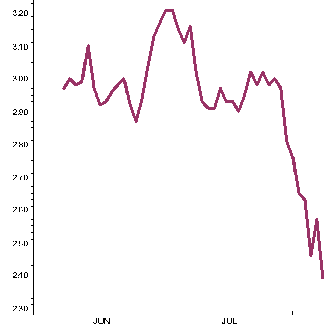 Standard & Poor’s beslut att sänka den amerikanska statens kreditbetyg har kritiserats av många, kanske främst för att marknaden fortfarande ser amerikanska statsobligationer som en av de säkraste tillgångarna. Räntan på 10-åriga amerikanska statsobligationer är ju mycket låg och har dessutom fallit påtagligt de senaste dagarna (se figur till höger). Detta indikerar att marknaden anser att risken är låg både för en regelrätt betalningsinställelse och för en mjuk betalningsinställelse via inflation.