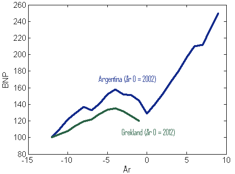 I ett tidigare inlägg här på Ekonomistas menade jag trots detta att Grekland bör överge euron. Mina skäl var två. För det första tyder erfarenheterna från Argentina 2001-2002 på att de kortsiktiga problemen inte behöver få katastrofala konsekvenser på något års sikt.