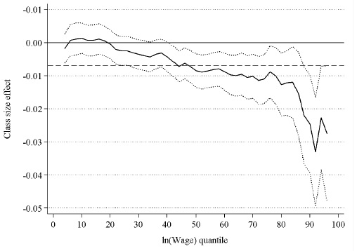 Att besvara den sista frågan är svårt då det ofta är oklart hur elevernas framtida produktivitet påverkas av minskad klasstorlek, även om man skulle känna till de kortsiktiga effekterna på elevernas studieresultat. En ny studie av Peter Fredriksson, Björn Öckert och Hessel Oosterbeek drar dock nytta av att man i Sverige kan följa människor över tid och de finner att investeringar i minskad klasstorlek är mycket lönsamma. Dessutom finner de att inkomstförlusterna av att gå i en stor klass är störst bland dem som tjänar mest, vilket framgår av figuren nedan.