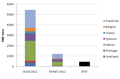 Offentliga sektorns bruttoskuld 2011, budgetunderskott + förfallande skuld under 2012 samt den europeiska räddningsfonden EFSFs utökade utlåningskapacitet. Källa: IMF Global Financial Stability Report September 2011 och egna beräkningar.