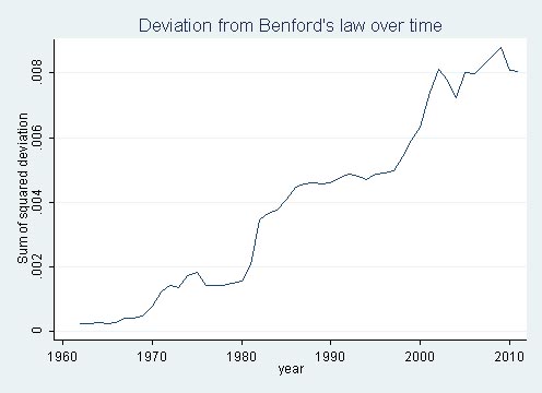 När någon försöker manipulera uppgifter är det emellertid svårt att hålla sig till Benfords lag. I stället tenderar de flesta att välja förstasiffra slumpmässigt vilket innebär att avvikelser från Benfords lag kan användas som ett mått på hur manipulerad en statistikuppgift är. Som visas i figuren nedan finner Wang att avvikelserna från Benfords lag i boksluten bland amerikanska företag ökar kraftigt över tid, vilket alltså tyder på att boksluten i allt högre grad baseras på manipulerade uppgifter.