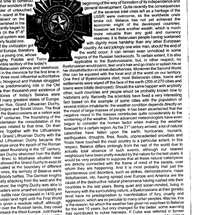…The weather condition depends directly on the mood of the large masses of people. It has been ascertained that the negative mood in the masses contributes quite considerably to the worsening of the weather…As the 21st century arrived, a lot of natural calamities have fallen upon the earth; hurricanes, tsunami, earthquakes, droughts, fires, floods, unprecedented snowfalls and frosts have touched the most country to a particular extent. In this respect, Belarus differs strikingly from the rest of the world due to actually total absence of such events, … It would be very probable to suppose that all these natural cataclysms are directly connected with the frame of mind of the people, over whom they are happening. … Maybe this is the reason for which the weather has given no surprises to Belarus for the last 10 years, but only changed for the better…