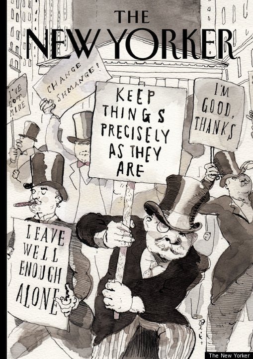 På omslaget till förra numret av The New Yorker återges följande demonstration på Wall Street. Den torde dock inte ha alltför mycket med de omtalade Occupy Wall Street-demonstrationerna att göra…
