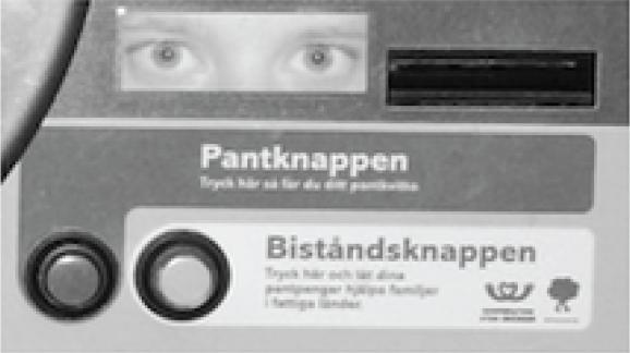 Trots att det finns ett par studier som finner en sådan effekt verkar sista ordet inte vara sagt. I en ny studie (gratisversion här) som är under publicering i Experimental Economics visar nationalekonomidoktoranden Mathias Ekström att en bild på ett par ögon inte påverkar huruvida vi väljer att skänka pengar till välgörenhet när vi pantar tomburkar. Mathias satte slumpmässigt upp bilder på ett par ögon på pantmaskiner i ett flertal Konsum-butiker i Stockholmsområdet. På pantmaskinerna finns sedan ett antal år två valmöjligheter efter att man petat in burkar och glas — en knapp om man vill ha ett tillgodokvitto på slantarna och en annan knapp om man vill skänka pengarna till välgörenhet. Med hjälp data från 16775 knapptryckningar från pantmaskinsföretaget kunde Mathias konstatera att andelen som skänkte till välgörenhet inte påverkades av ögonmanipulationen.