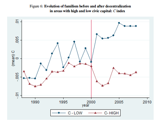 Så vad hände? Svaret visar sig bero på de underliggande ”socio-kulturella normerna” på regional nivå. I områden där fler läser dags(nyhets)tidningar och där fler donerar blod hände ingenting (möjligen gick nepotismen ner), medan i områden där det civila samhället var svagare så ökade rekryteringen av familjemedlemmar markant. Måttet är som väntat korrelerat med en nord-syd dummy men resultaten är klart svagare om man använder detta mått i stället. Delegerandet av anställningsbeslut till lokalnivå underlättade alltså gynnandet av familjemedlemmar i områden där den offentliga granskningen av politikerna var svag. Figuren nedan visar utvecklingen av ett finurligt konstruerat index på hur vanligt ett visst efternamn är (i den underliggande lokala befolkningen) och hur vanligt det namnet är inom enskilda fakulteter vid enskilda universitet. Indexets utveckling över tid är uppdelat mellan regioner med högt (röd linje) respektive lågt dagstidningsläsande (blå linje).