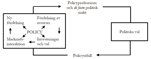 Resten av bilden illustrerar den politiska delen av det hela. Baserat på hur individer uppfattar att samhället funkar så formar de preferenser som kanaliseras genom en politisk process styrd både av fördelningen av resurser och de politiska spelreglerna. I slutändan resulterar detta i ny policy som påverkar marknadsutfall och interaktion.