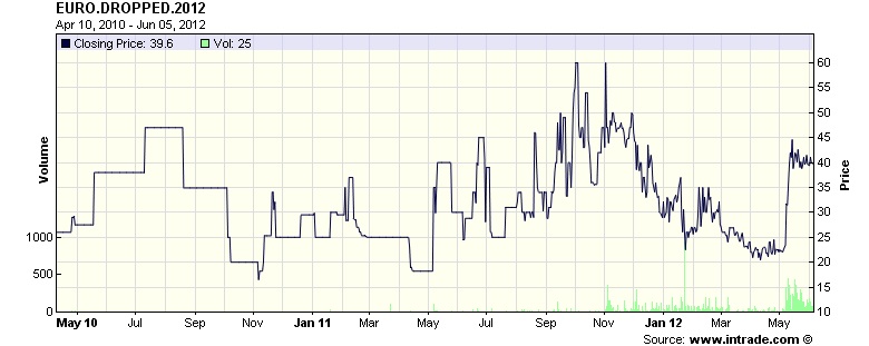 Bilden nedan visar att bedömarna just nu anser att det är 39 procents risk för att något land lämnar euron detta år. På samma marknad finns även en handel risken att något land lämnar eurosamarbetet 2013 respektive 2014. Aktuella sannolikheter för att så sker är 55% och 65%, dvs att sannolikheten för att något land lämnar euron växer hela tiden.