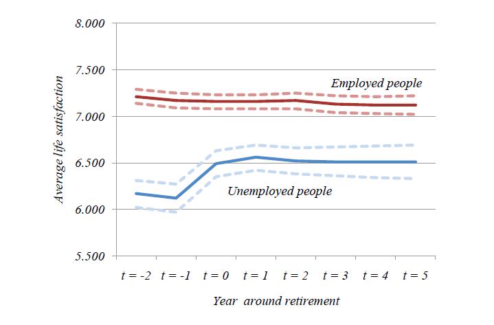Nationalekonomidoktoranden Martin Berlin skriver på Lyckobloggen om en studie som studerar välbefinnandet vid pensionering. Nedanstående graf är hämtad från studien och visar att långtidsarbetslösas välbefinnande ökar vid pensionering, medan de som har ett jobb inte upplever någon förändring. För en nationalekonom kan detta förefalla lite paradoxalt. Arbete antas vanligen vara ett nödvändigt ont och fritid är kul – arbetslösa som redan ”konsumerar fritid” borde därför inte uppleva någon större förändring i välbefinnande vid pensionering. Den tolkning av grafen som studiens författare fokuserar på är att det är stigmatiserande att vara arbetslös, men att man slipper detta stigma vid pensionering och därmed blir lyckligare. En annan tänkbar förklaring är att man inte längre behöver söka nya jobb eller oroa sig för att inte kommer få ett nytt jobb.
