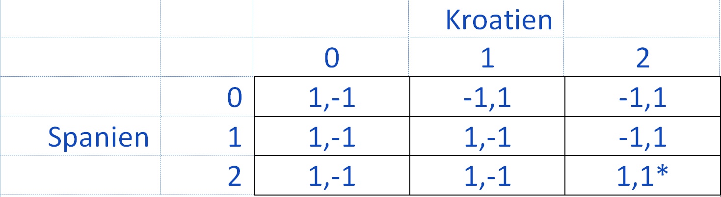 den första siffran motsvarar Spaniens utfall, medan den andra motsvarar Kroatiens. (1,-1) motsvarar alltså ett resultat som leder till att Spanien går vidare men inte Kroatien, medan (-1,1) motsvarar ett resultat som leder till att Spanien inte går vidare medan Kroatien gör det. av utfallens kodning kan vi alltså utläsa att vid 0-0 och 1-1 avancerar Spanien men inte Kroatien. det går för övrigt lika bra att koda utfallen (A,B) eller (1,0).