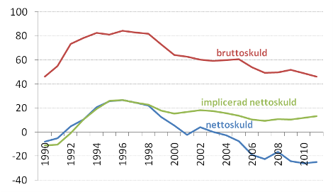 • Jag håller med om att bruttoskuldens storlek också är viktig information, och att det är viktigt att den inte blir alltför stor. Däremot är jag tveksam till om man kan påstå att den krympande bruttoskulden beror på överskottsmålet och god tillväxt. Ett sådant påstående kräver nog åtminstone ett antagande om att tillgångsportföljen hålls oförändrad. Men under det senaste dryga decenniet har ju staten sålt en hel del av sina finansiella tillgångar, och jag tror att även AP-fonderna har börjat betas av (pensionssystemets tillgångar uppgick till 36 procent av BNP 1996, men var nere på 26 procent 2011).