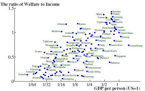• Figuren visar välfärd i förhållande till BNP per capita. Norge har väldigt hög BNP per capita, men ändå en skattad välfärd som är inte är tydligt högre än Sveriges och USAs (Luxemburg har högst välfärd, därefter kommer en grupp med länder där Norge, Sverige och USA ingår).
