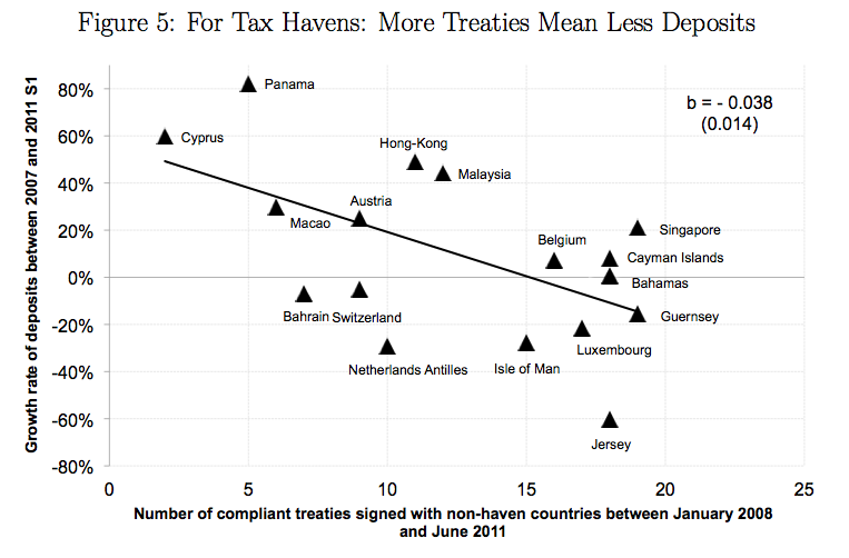 Figuren visar relationen mellan antalet undertecknade informationsutbytesavtal (x-axeln) och hur mycket insättningsvolymen förändrats mellan 2007-2011. Sambandet är tydligt; ju mindre transparent man är som skatteparadis desto större inflöde av pengar.