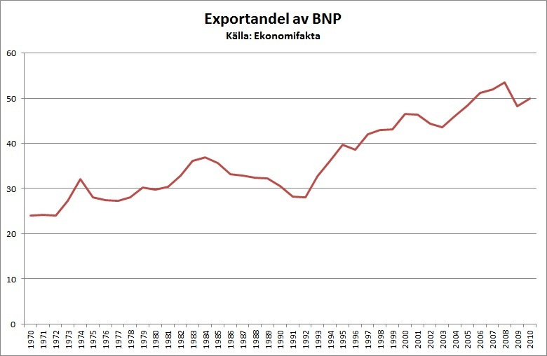 Regeringen har som bekant ambitionen att till 2015 dubbla exporten från 2010 års nivåer. Förutom att det i en marknadsekonomi kan tyckas underligt att ha denna typ av femårsplaner för produktionens komposition ter sig målet märkligt ur ett historiskt perspektiv. Under de senaste 40 åren har exporten ökat stadigt även om det gått lite upp och ner i takt med den globala konjunkturen. Förutom ett par år precis innan finanskrisen slog till har exportandelen aldrig varit så hög som idag.