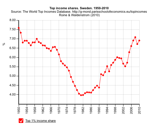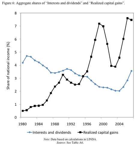 I torsdags (14 februari) sändes Dokument inifråns ”Lönesänkarna” i SVT. Programmet handlade om de ökade inkomstskillnaderna och framförallt fokuserades på relationen mellan kapital och löner sedan 1980-talet. På det hela taget var programmet bra och gav en faktamässigt riktig bild av utvecklingen (även om det förstås finns en rad problem med definitioner och alternativa sätt på vilka man kan se på utvecklingen, vilket också flera som kommenterat programmet tagit fasta på. Av dessa är konstateranden som att det faktiskt inte har skett någon ”lönesänkning” eftersom reallönerna ökat stadigt i Sverige förstås viktiga även om man hoppas att de flesta kan skilja på andelar och nivåer). I mitt tycke hade dock programmet ett djupare problem. Framförallt saknade jag frågan ”Varför har detta skett?”Om vi håller oss till den del av utvecklingen som handlar om (de privata) inkomstskillnadernas ökning och vilken roll kapital spelat i denna utveckling (för att undvika trassel med relationen till BNP som så flitigt diskuterats av andra) så kan denna illustreras av nedanstående bilder. Den första visar toppinkomstandelens utveckling (före skatt och transfereringar) ökat sedan 1980. Den andra visar att kapitalandelen av totala inkomster vuxit sedan 1980. Främst har detta skett genom att de realiserade kapitalvinsterna blivit viktigare (något jag och Daniel studerat relativt ingående) men på senare år har även utdelningar vuxit som post i totala inkomster. Då dessa är koncentrerade till inkomstfördelningens topp bidrar denna utveckling till ökade inkomstskillnader. Detta säger inte i sig något om de bakomliggande aktiviteterna. Vi kan helt enkelt inte, baserat på dessa data, avgöra om de realiserade kapitalvinsterna och kapitalinkomsterna genereras av arbete (i klartext inkomster som borde ha redovisats som ”lön” om det inte funnits skattemässiga skäl till att inte göra det) eller om det är avkastning på tillgångar som inte primärt har med ens arbetsinsats att göra. Denna distinktion är förstås viktig för tolkningen (något som vi diskuterat förut t.ex. här).