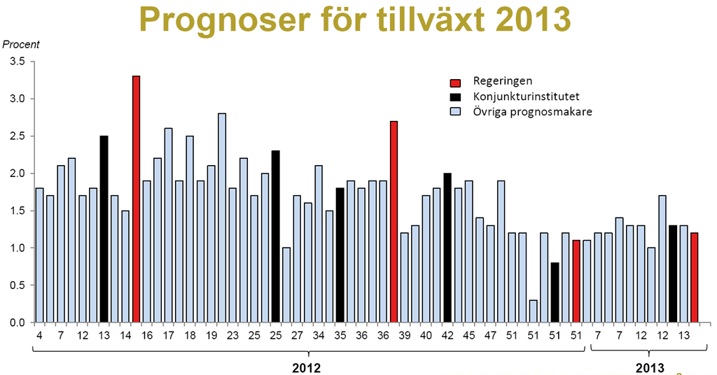 imageEn av de inbjudna kommentatorerna var Jens Henriksson, vd på Stockholmsbörsen och i höst ny koncernchef för Folksam. Jens var inte överdrivet kritisk, vare sig mot rapporten eller heller mot regeringens finanspolitik. Men han instämde ändå i Rådets ganska skarpa kritik av finansdepartementets bristfälliga prognoser. Som bilden till höger visar (från sid 63 i rapporten) har dessa avvikit markant från andra bedömares, och med tanke på att en sittande regering har klara intressen av att skönmåla konjunkturen, eftersom detta ger ökat reformutrymme vilket är särskilt gynnsamt under valår, är skönmålningen klandervärd.