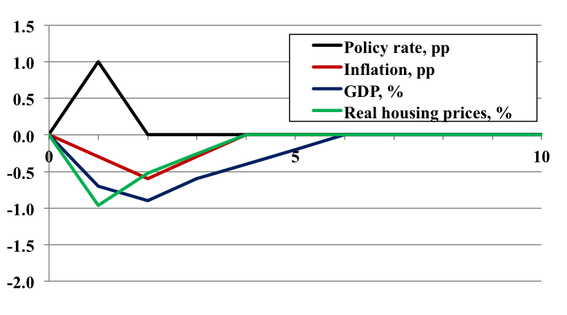 En högre ränta under ett år leder under några år till tillfälligt lägre inflation, real BNP och reala bostadspriser. Efter 3-5 år är inflationen, real BNP och reala bostadspriser tillbaka på den nivå de skulle haft utan den tillfälliga räntehöjningen. Figur 1 visar för varje år från år 0 till år 10 hur en högre reporänta under år 1 leder till avvikelser från en basnivå (eller, mer precist, avvikelser från en basbana) för inflationen, real BNP och reala bostadspriser. Avvikelserna för reporäntan och inflationen visas i procentenheter, medan avvikelserna för real BNP och reala huspriser visas i procent av basnivån.1